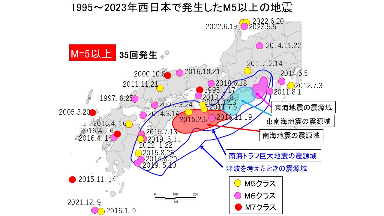 今年は1995年1月17日の阪神・淡路大震災(地震名は1995年兵庫県南部地震)から30周年ということで、テレビ局が特別番組を組み、新聞社が特集を組んだり、また各地で記念行事などが行われている。以来、西日本だけでもにぎやかなくらい地震が起こっている。図-1は阪神・淡路大震災以後、一昨年(2023年)末までに西日本各地で起こった地震をプロットしたものである。なぜ一昨年末までにしてあるかというと、2024年1月1日の能登半島地震が起こってから、能登半島周辺は丸が重なって描くことができないからである。まさか元日で、みんなが晴れやかな気持ちになっているとき、午後だからお屠蘇やお酒を飲んでいい気持ちになっている人もたくさんいたであろう時に地震が起こるとは、だれも思っていなかったであろう。